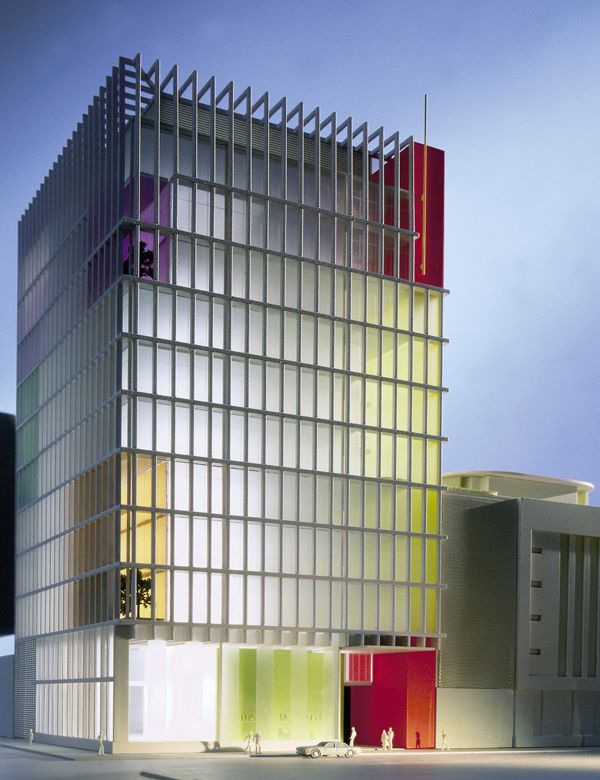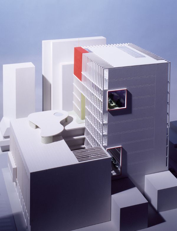 Visible through the outer façade is the glazed inner skin of the building, featuring sky courts and sheltered gardens which serve to layer and articulate the building's elevations.