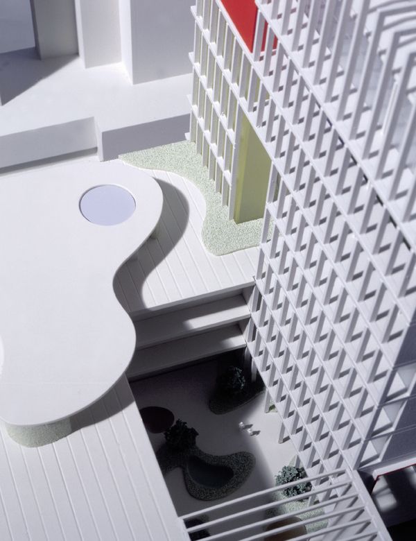 Shortlisted competition entry for the new headquarters of the Bank of Mauritius, to be located on a prominent urban site. The cladding is made up of a grid of deep fins, which have the dual purpose of creating an elegant ‘cloak’ for the building as well as an efficient environmental shield against the local climatic conditions.