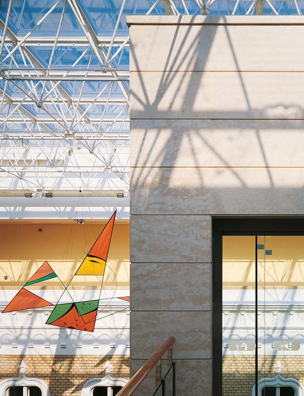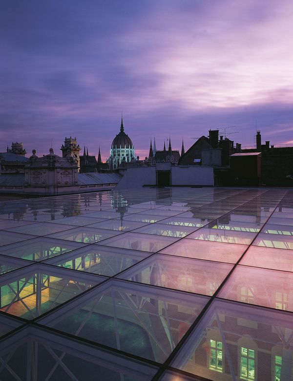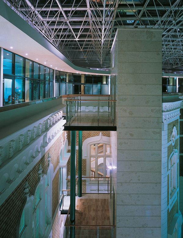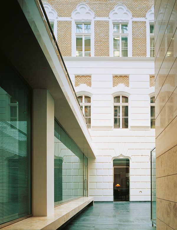 Refurbishment, conversion and fitting-out of a listed historic building within one of Budapest's conservation areas. The HQ had to function to international banking standards, with the need for additional space paramount, all to be achieved without there being any external manifestation of these changes - this latter a fundamental planning restriction. Martin Pawley described the project as “an ingenious solution to working in a historic context”.
