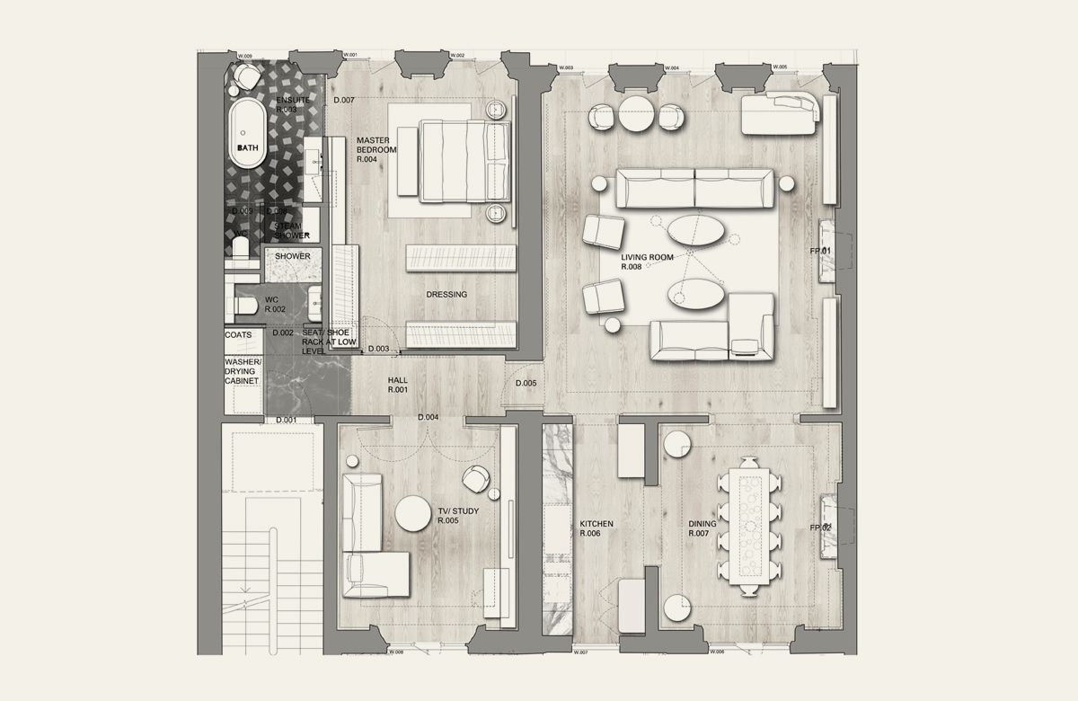 Refurbishment and conversion of a large ‘piano nobile’ apartment within a Grade II listed terrace.