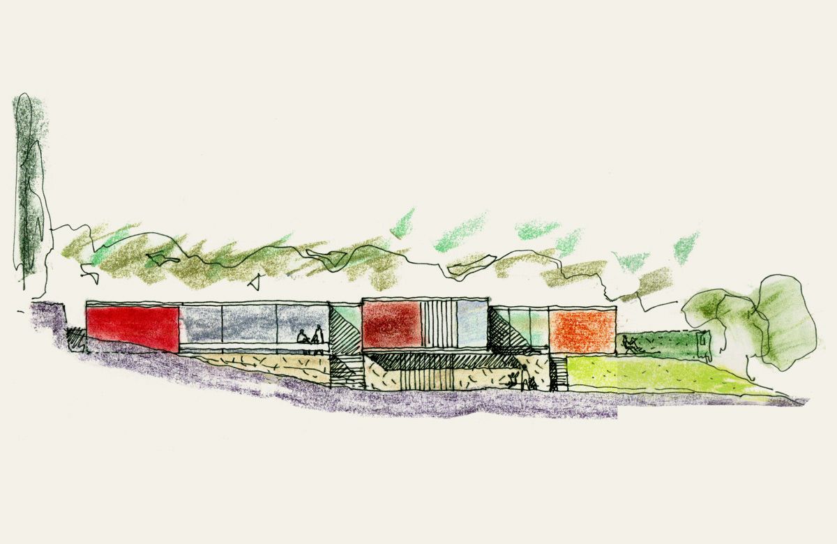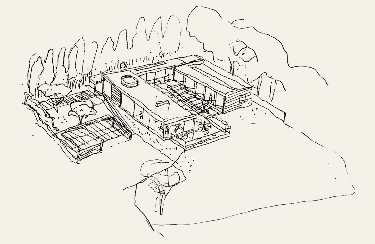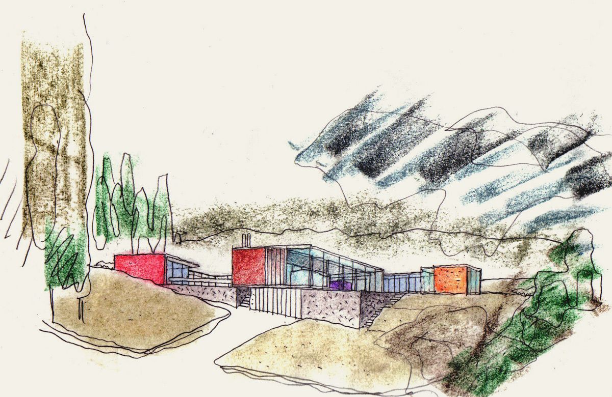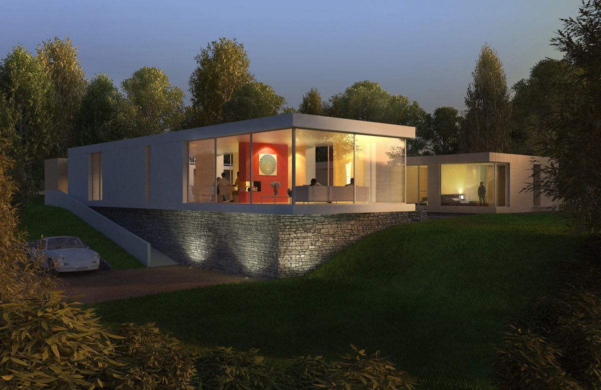 New-build family house in Guildford. The building sits on a large, landscaped plot as a contemporary counterpoint to its surrounding mock Voysey/Lutyens neighbours. Conceived as a courtyard house, the dwelling appears to hover above the sloping site, orientated to optimise views to the Surrey hills. The designs were published in “Building Design”.